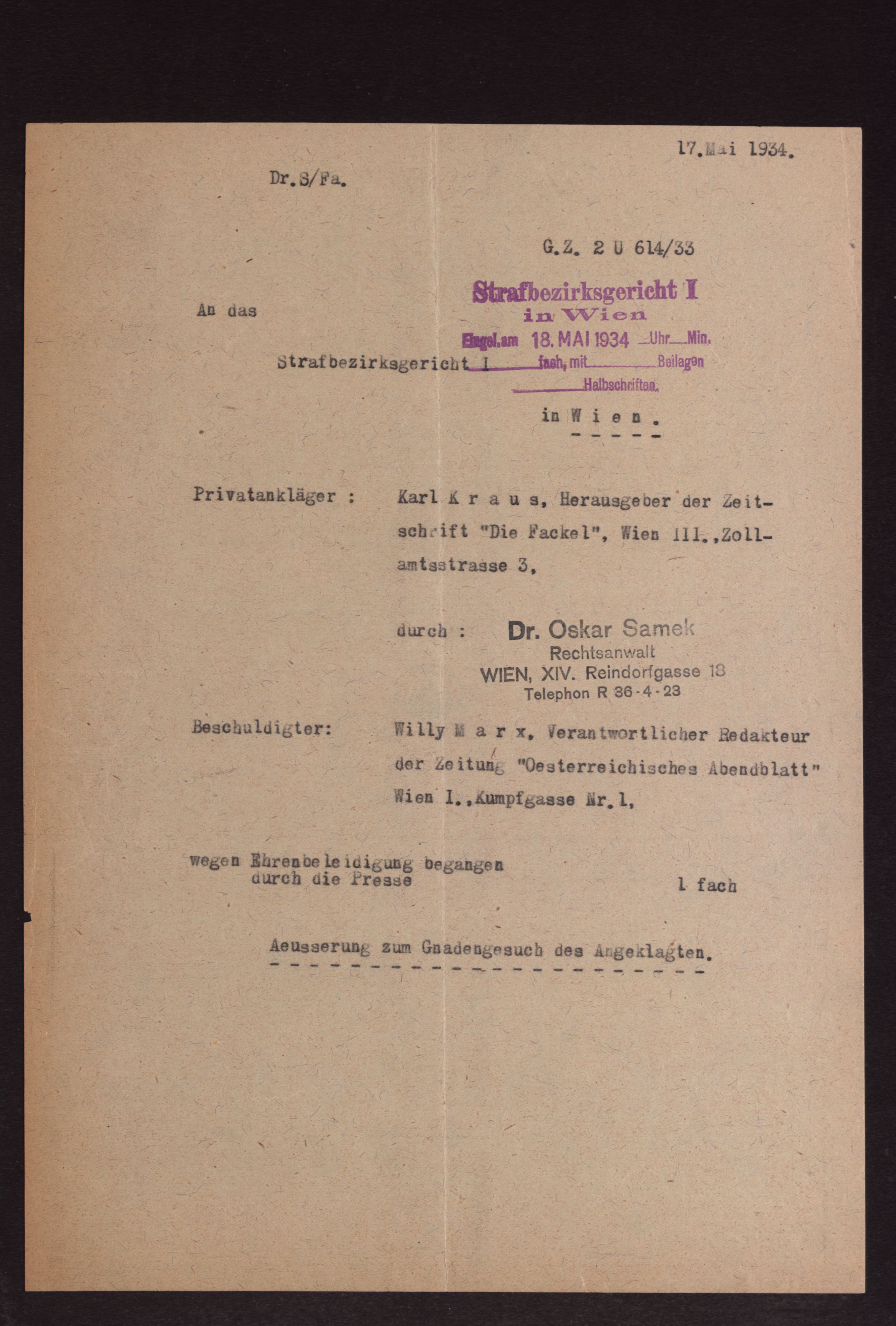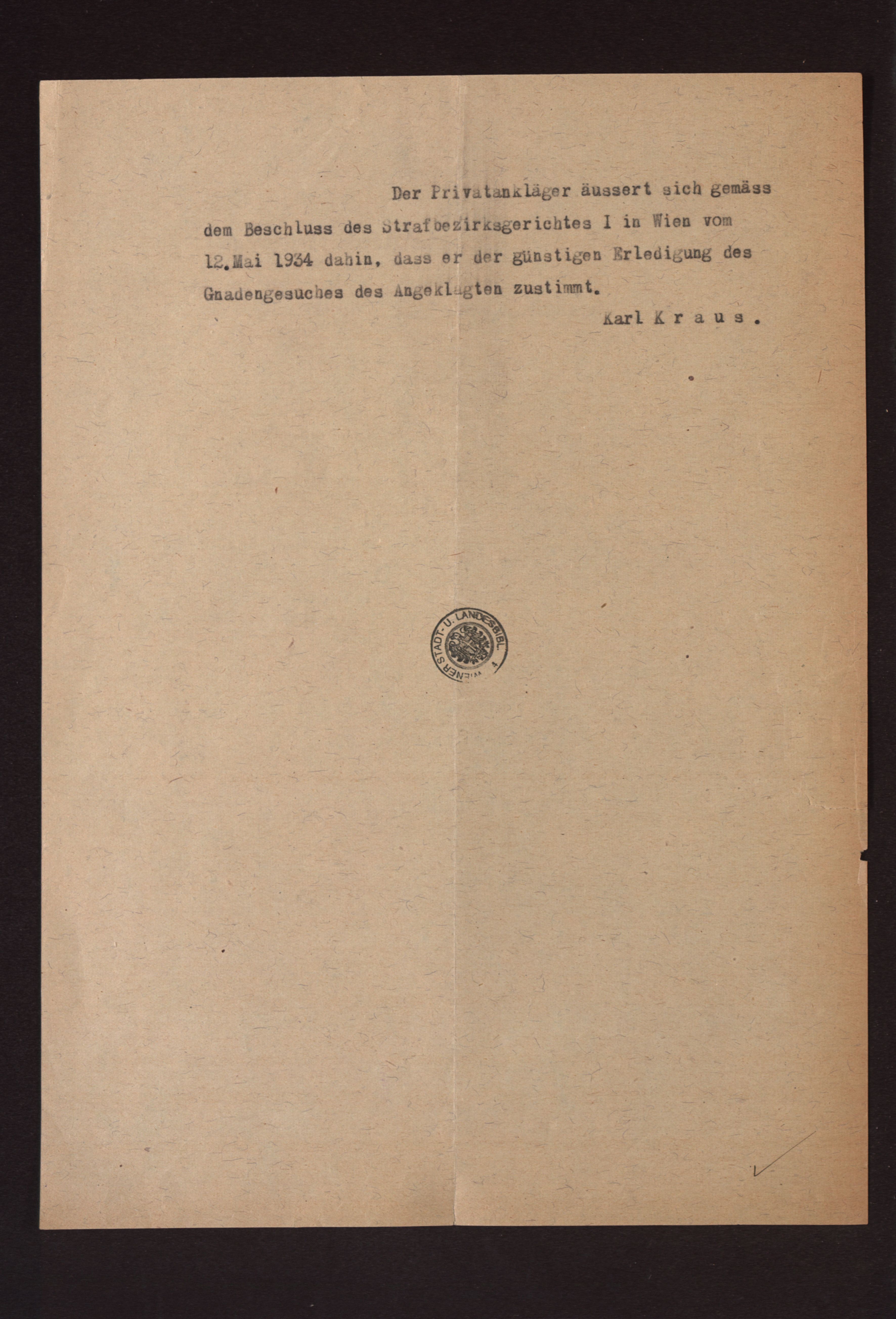 Signatur: ZPH 1545 - 186.18.Anzahl der Seiten: 1Hauptnummer: 186Nebennummer: 18Datum: 17.05.1934 >> Karl Kraus ca. Österreichisches Abendblatt