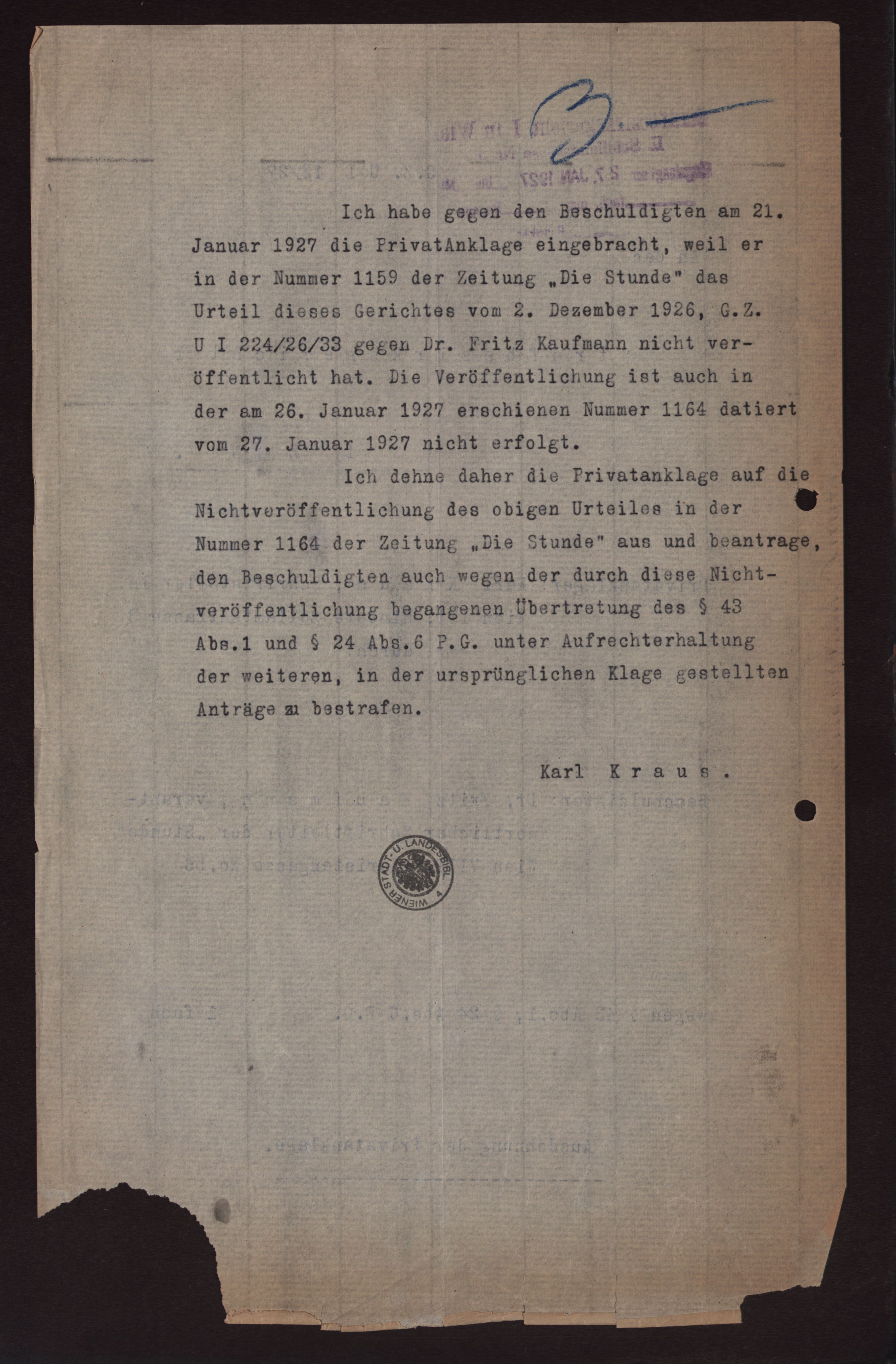 Signatur: ZPH 1545 - 24.6.Anzahl der Seiten: 1Hauptnummer: 24Nebennummer: 6Datum: 27.01.1927 >> Karl Kraus ca. Die Stunde