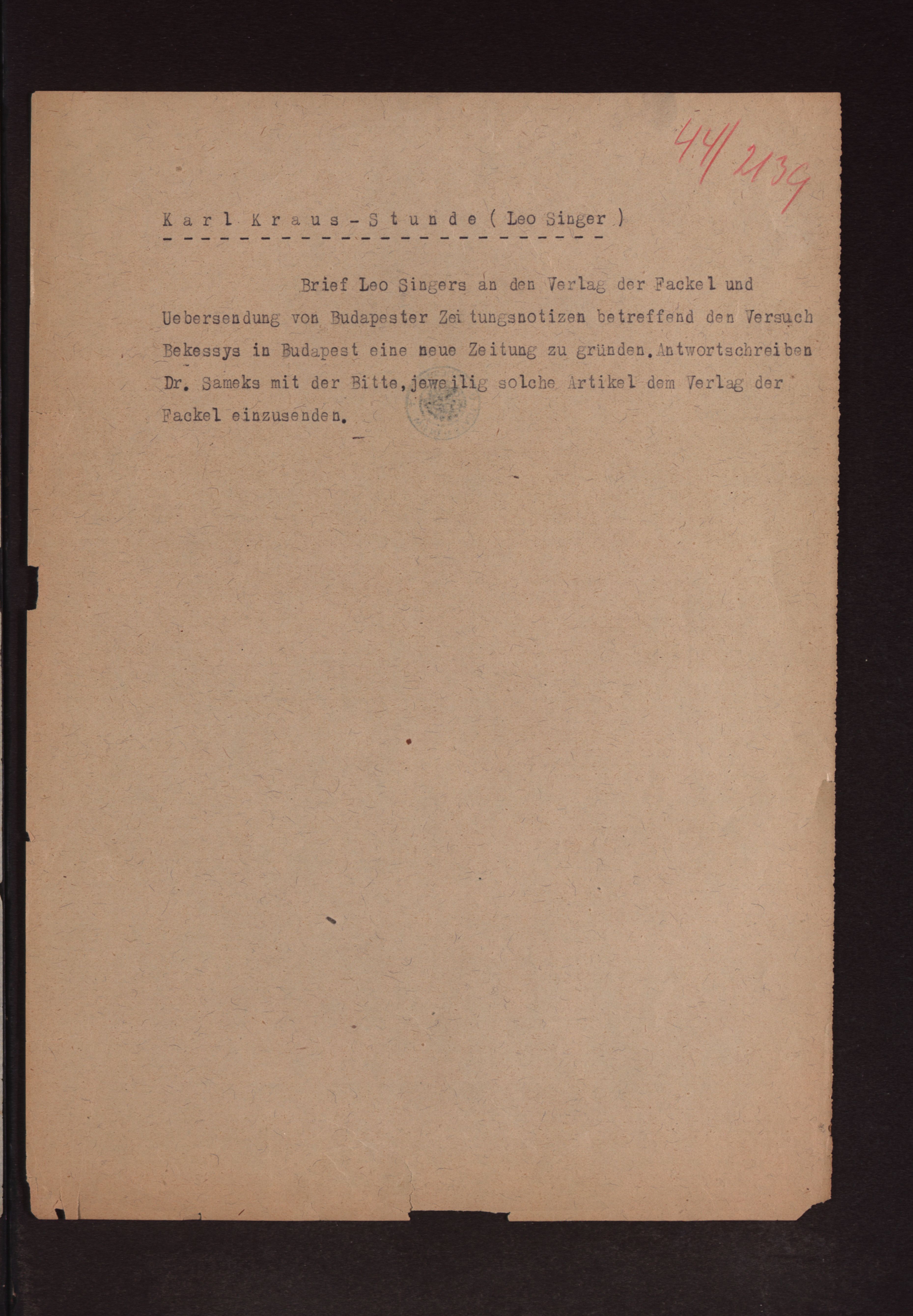 Signatur: ZPH 1545 - 48.9.Anzahl der Seiten: 1Hauptnummer: 48Nebennummer: 9Datum: 24.11.1927 – 29.11.1927 >> Korrespondenz mit Leo Singer (betreffend Békessys Versuche, in Budapest eine neue Zeitung zu gründen)