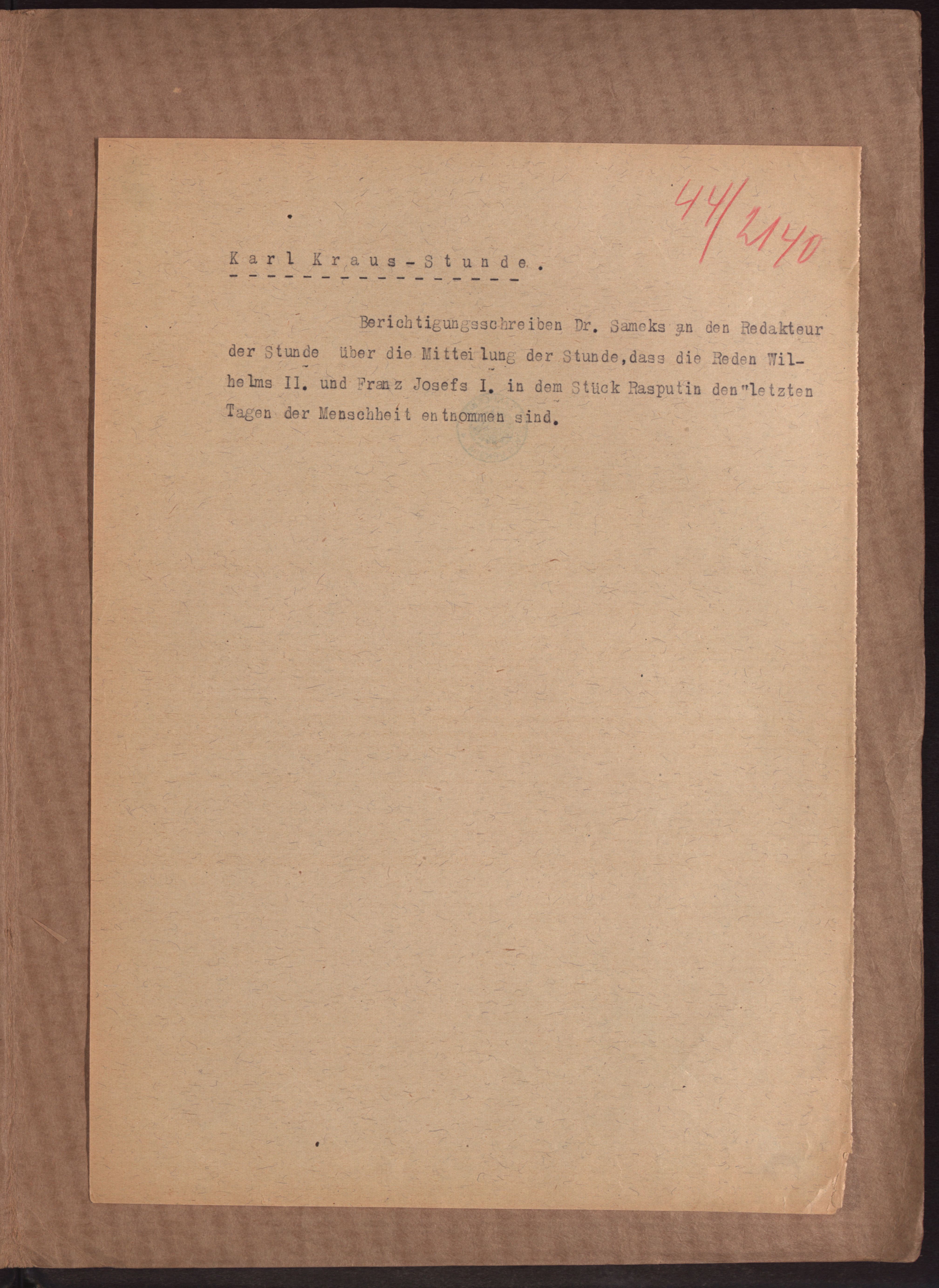 Signatur: ZPH 1545 - 97.2.Anzahl der Seiten: 1Hauptnummer: 97Nebennummer: 2Datum: 12.11.1927 – 01.12.1927 >> Karl Kraus ca. Die Stunde