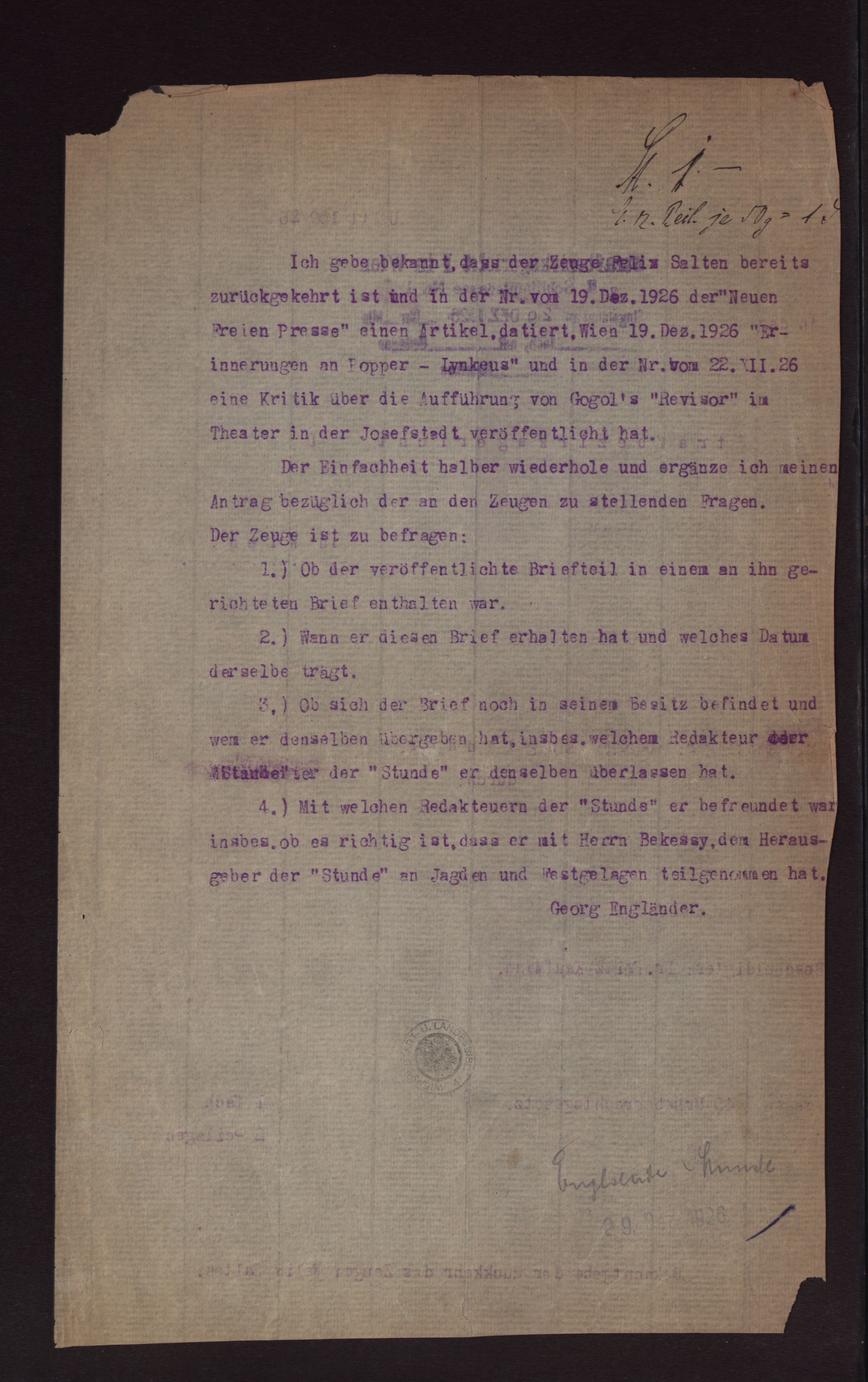 Signatur: ZPH 1545 - 58.4.Anzahl der Seiten: 1Hauptnummer: 58Nebennummer: 4Datum: 29.12.1926 >> Klage Georg Engländers (Bruder Peter Altenbergs) gegen Fritz Kaufmann