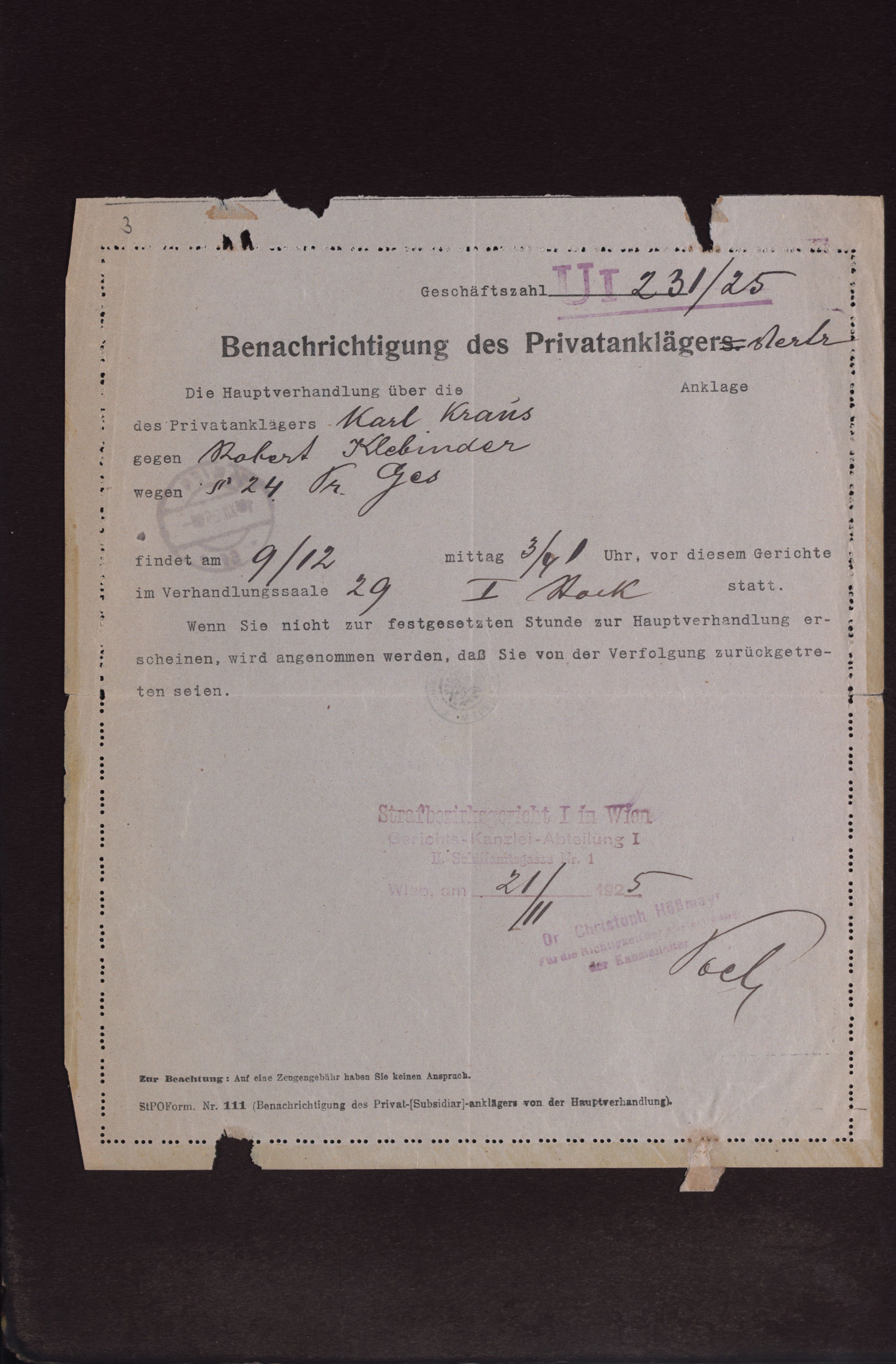 Signatur: ZPH 1545 - 18.3.Anzahl der Seiten: 1Hauptnummer: 18Nebennummer: 3Datum: 21.11.1925 >> Karl Kraus ca. Die Stunde
