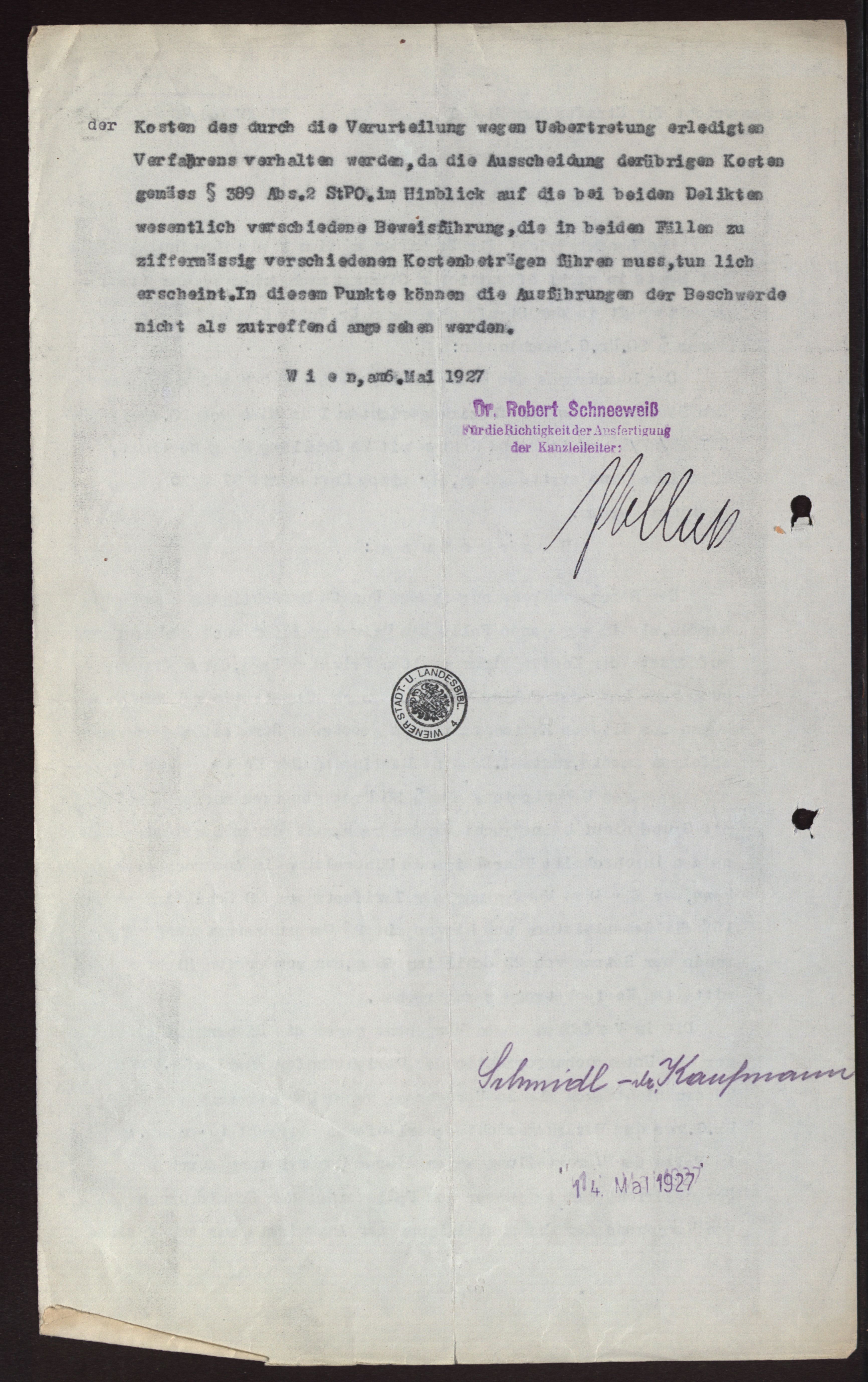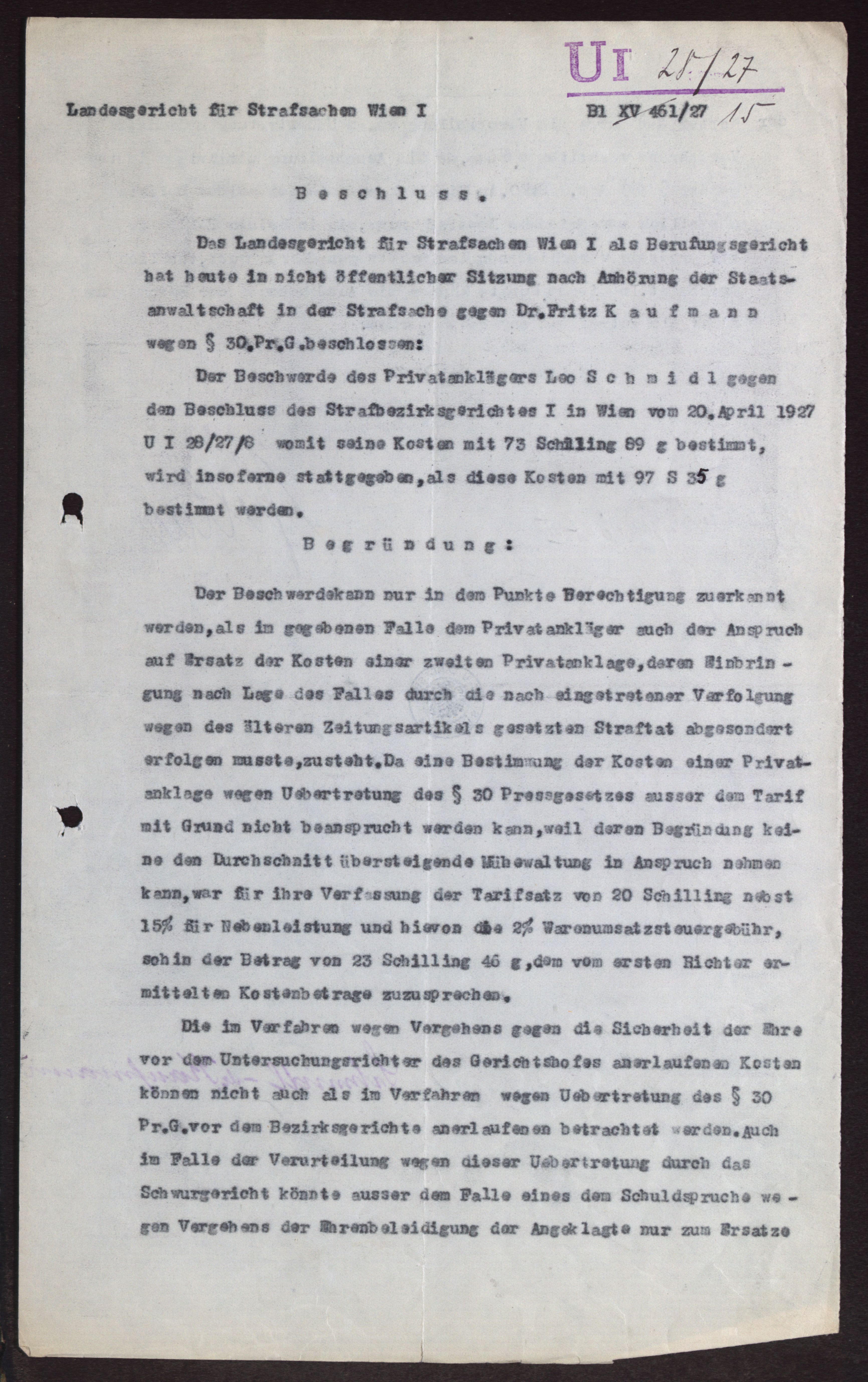 Signatur: ZPH 1545 - 57.58.Anzahl der Seiten: 1Hauptnummer: 57Nebennummer: 58Datum: 06.05.1927 >> Prozess Leo Schmidl ca. Emmerich Békessy