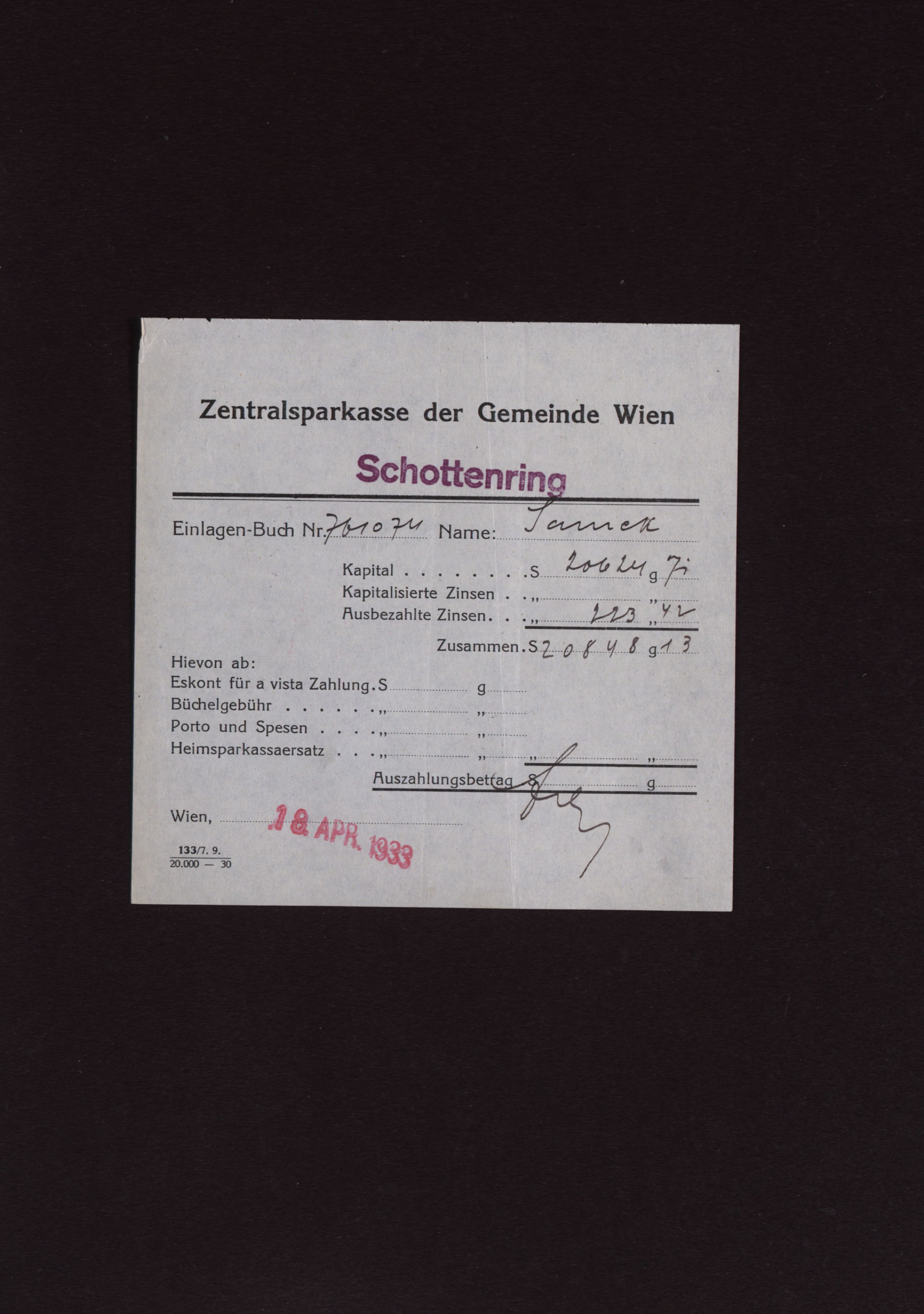 Bestätigung über Einlagen bei der Zentralsparkasse der Gemeinde Wien, Schottenring