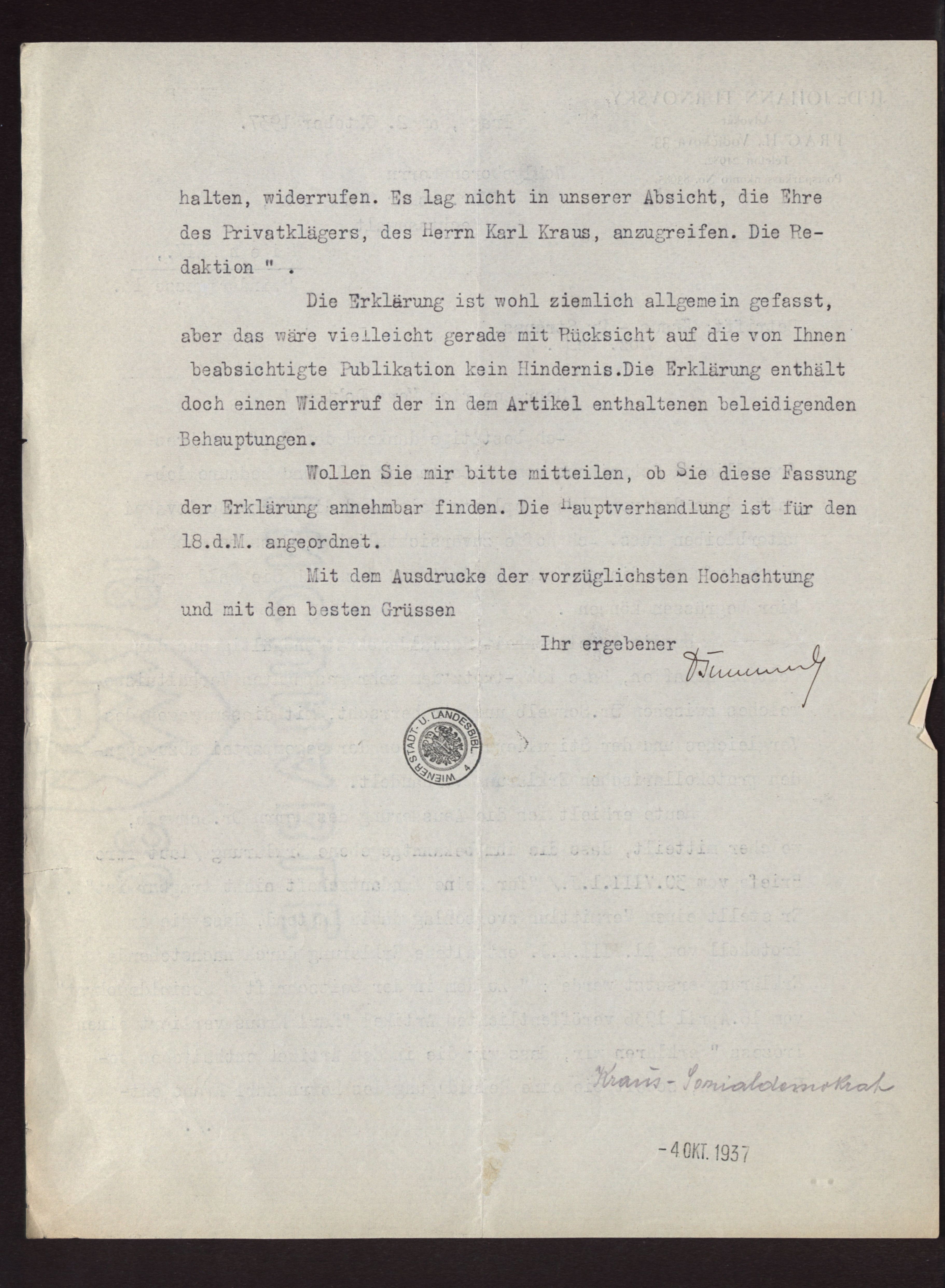 Signatur: ZPH 1545 - 193.186.Anzahl der Seiten: 1Hauptnummer: 193Nebennummer: 186Datum: 02.10.1937 >> Karl Kraus ca. Sozialdemokrat