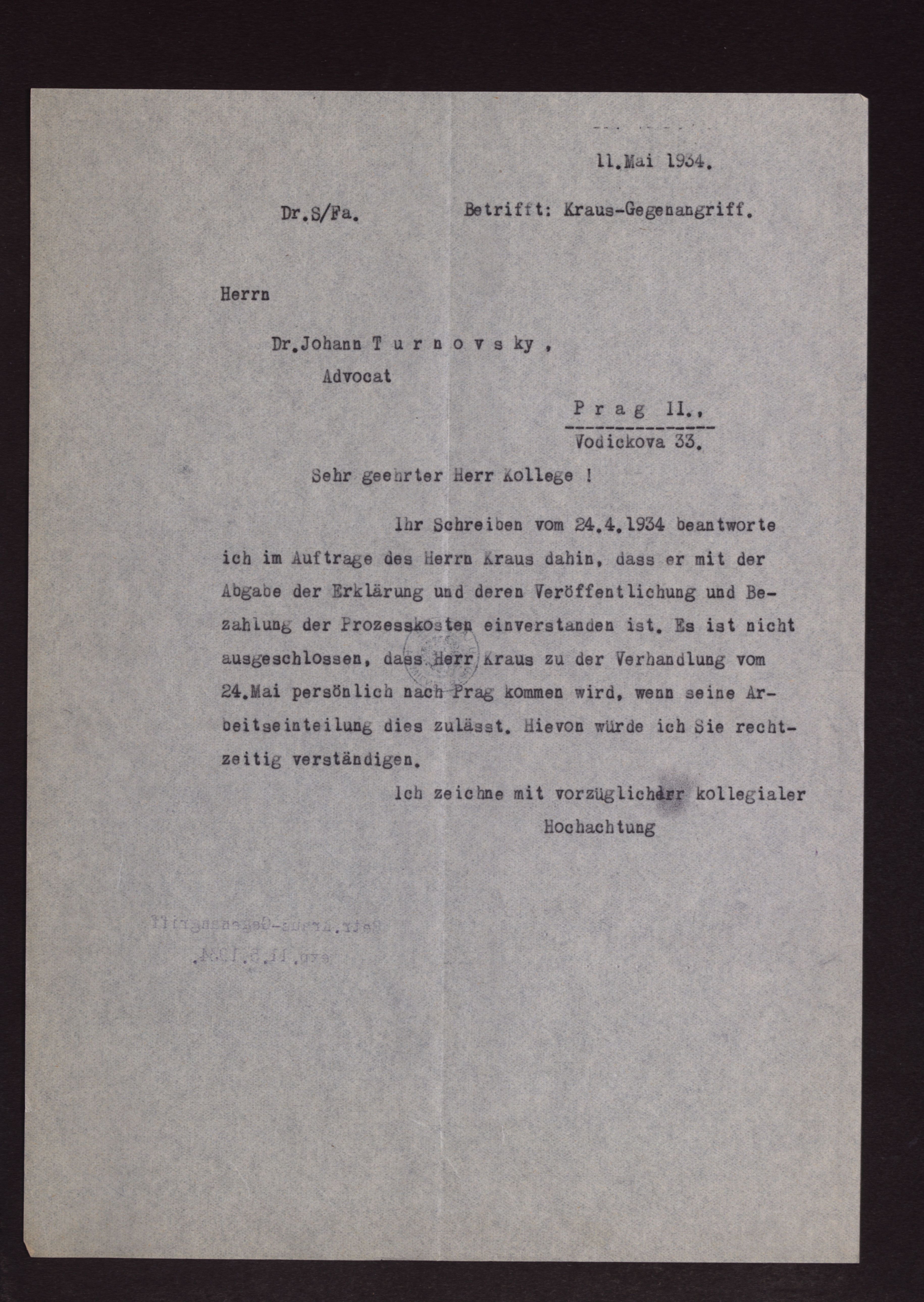 Signatur: ZPH 1545 - 189.46.Anzahl der Seiten: 1Hauptnummer: 189Nebennummer: 46Datum: 11.05.1934 >> Karl Kraus ca. Gegen-Angriff