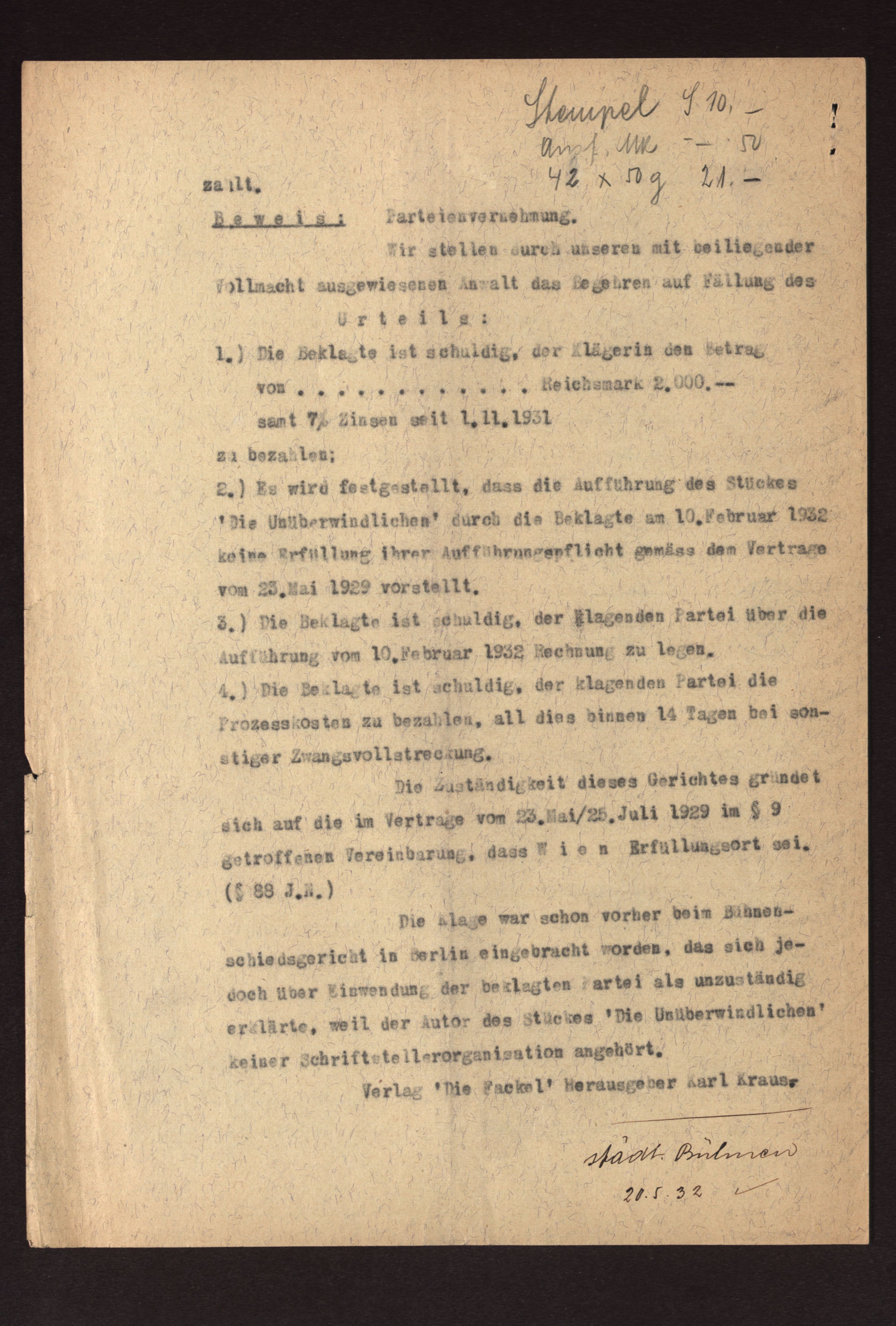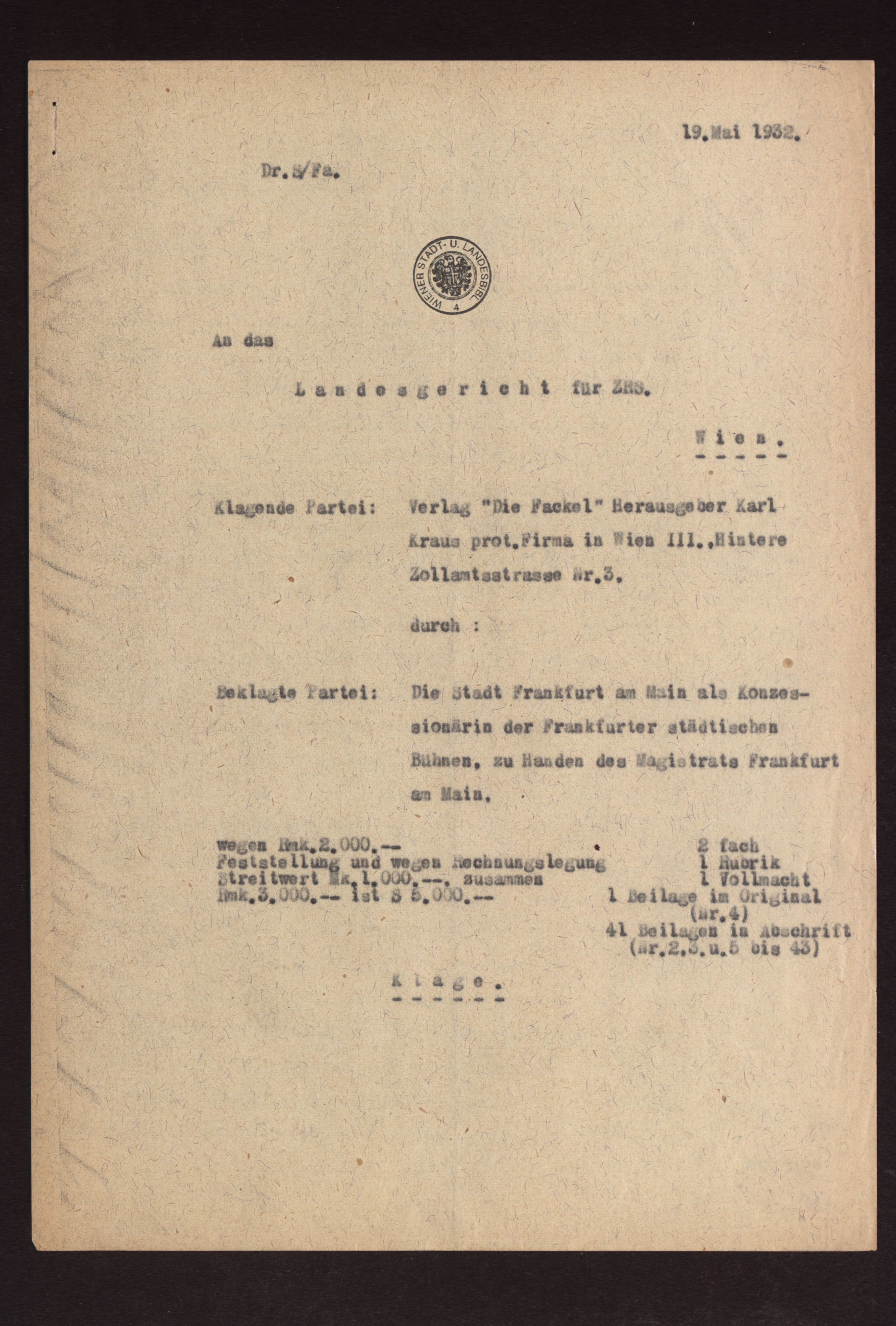 Signatur: ZPH 1545 - 125.114.Anzahl der Seiten: 7Hauptnummer: 125Nebennummer: 114Datum: 19.05.1932 >> Karl Kraus ca. Frankfurter Städtisches Schauspielhaus
