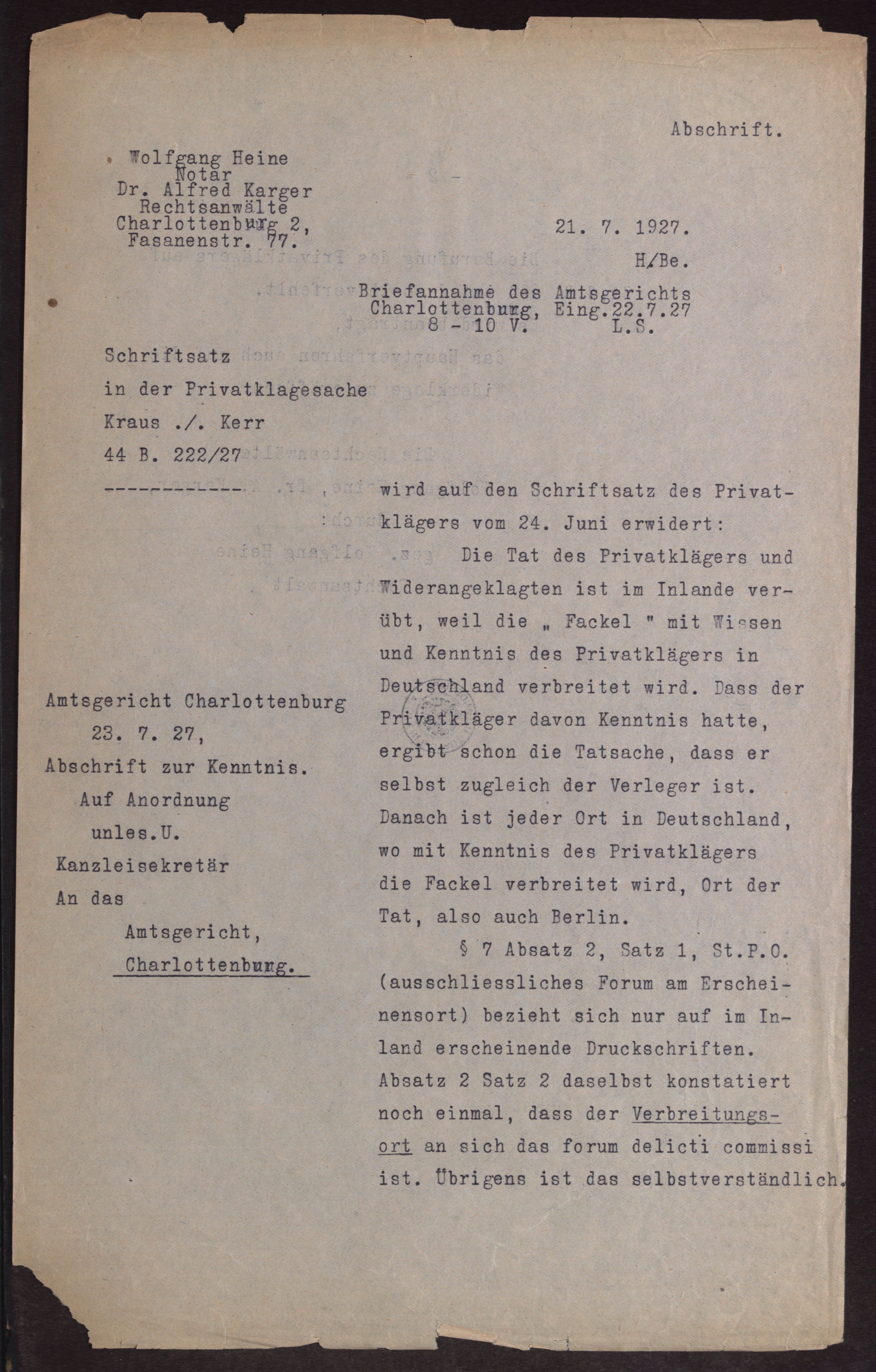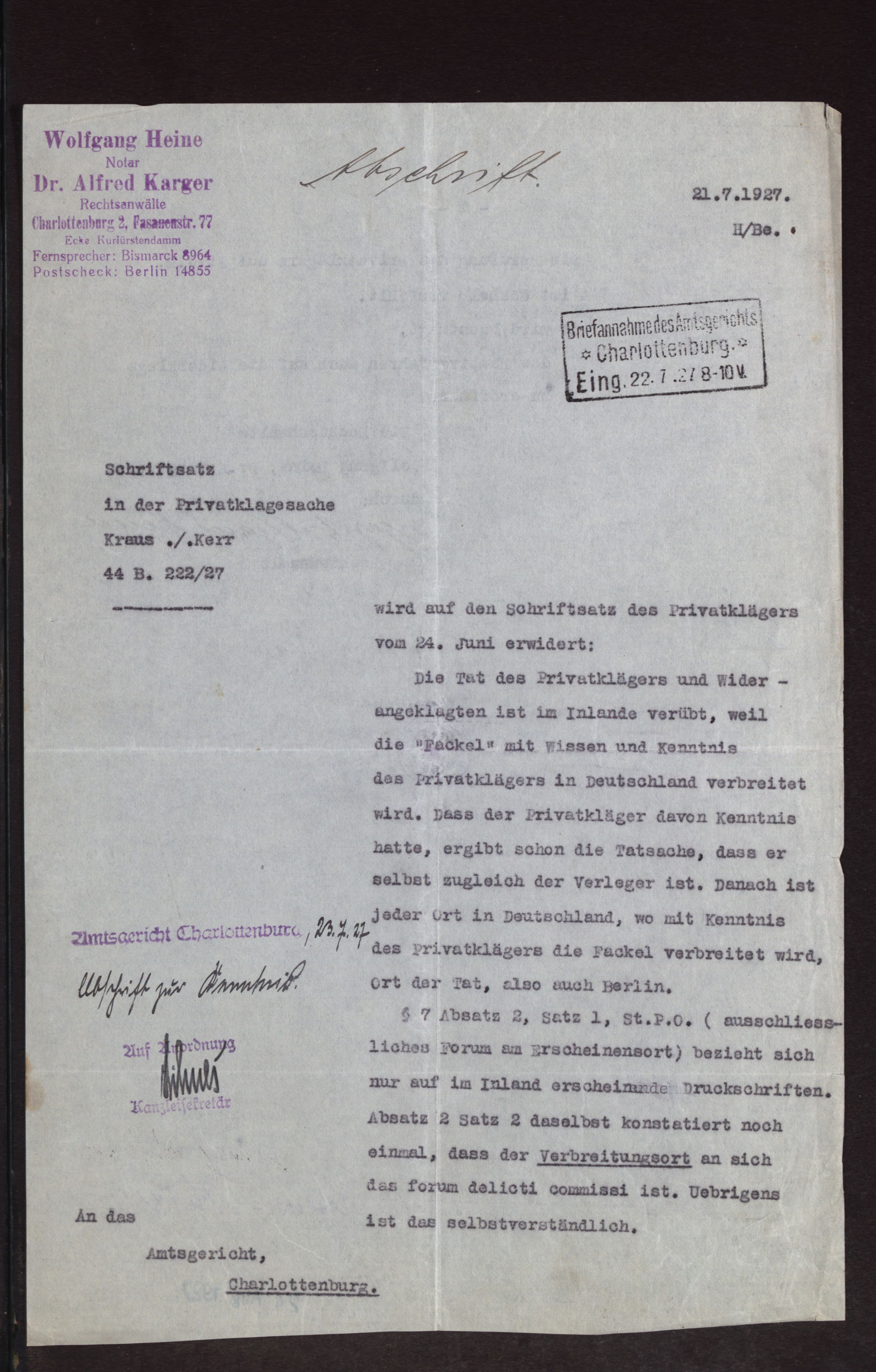 Signatur: ZPH 1545 - 68.34.Anzahl der Seiten: 3Hauptnummer: 68Nebennummer: 34Datum: 21.07.1927 >> Karl Kraus ca. Alfred Kerr