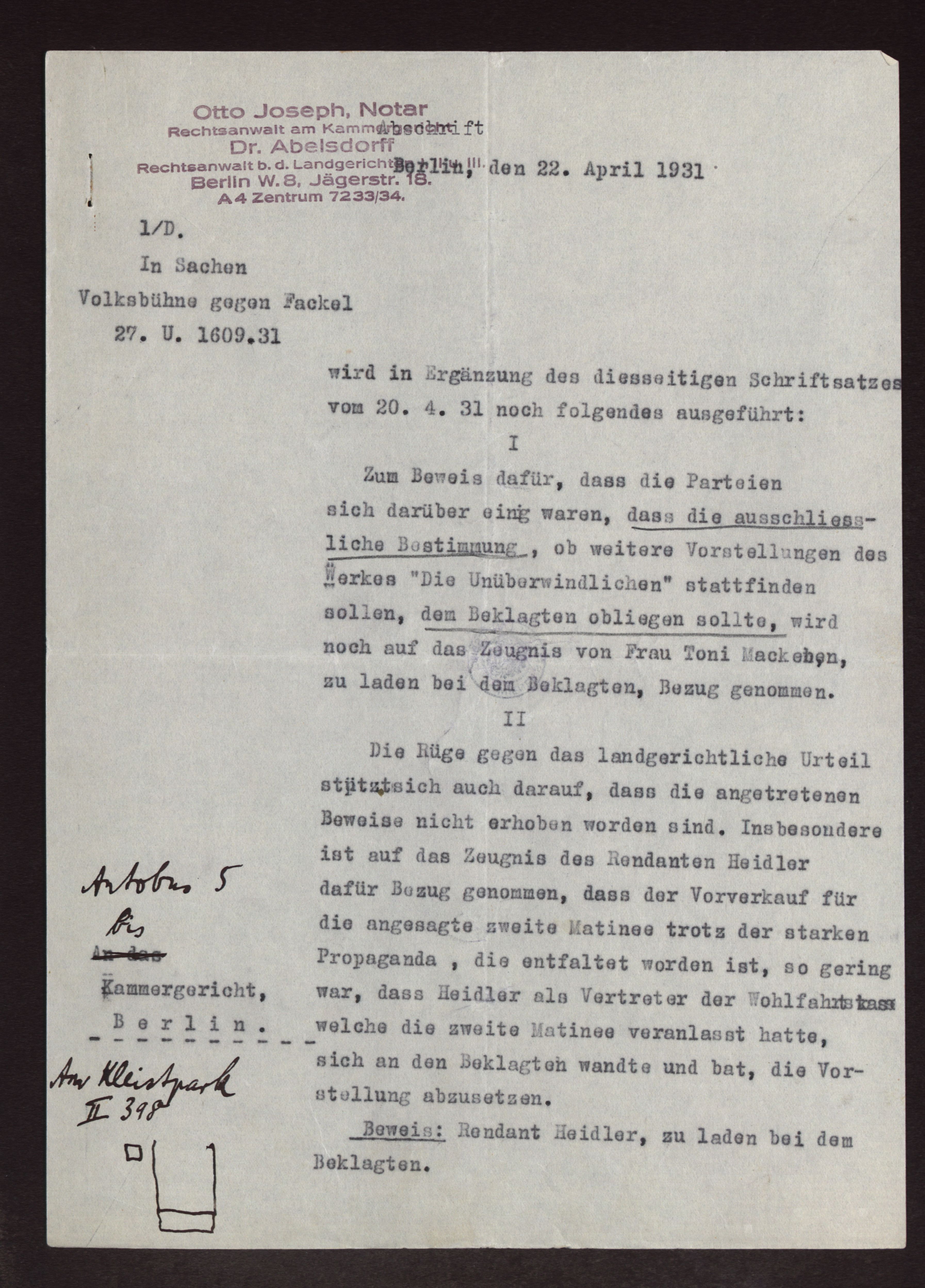 Signatur: ZPH 1545 - 136.28.Anzahl der Seiten: 5Hauptnummer: 136Nebennummer: 28Datum: 22.04.1931 >> Karl Kraus ca. Volksbühne Berlin