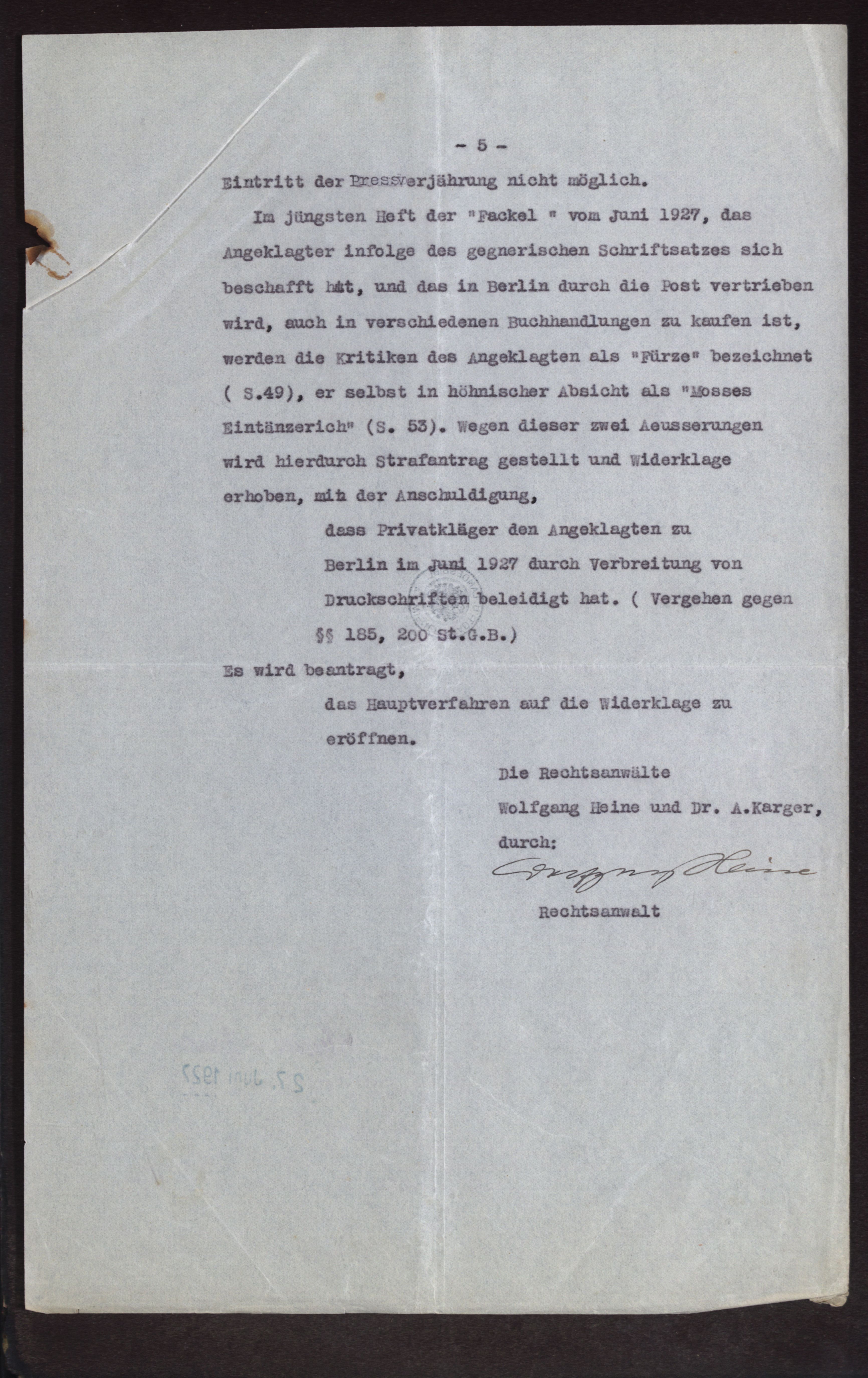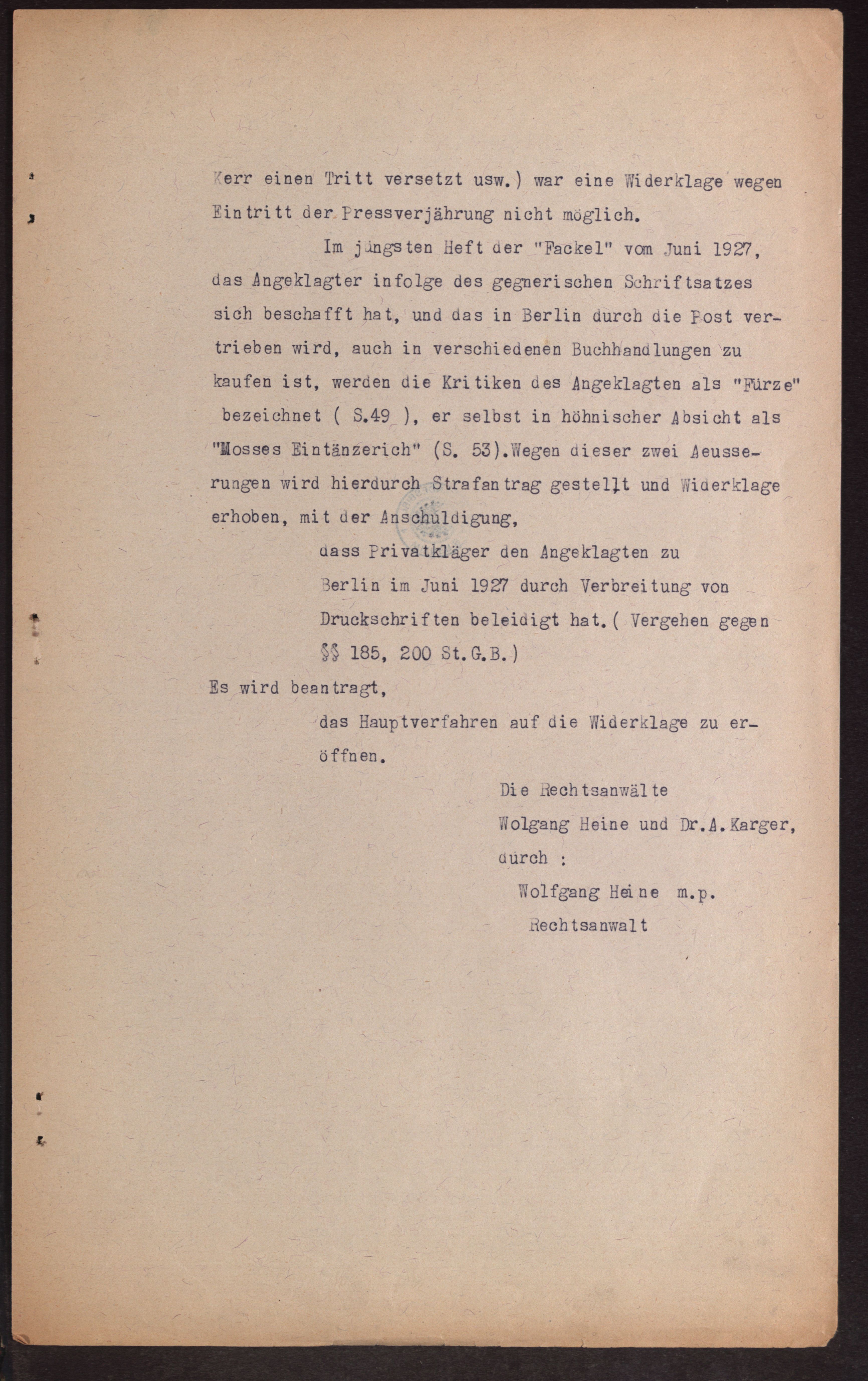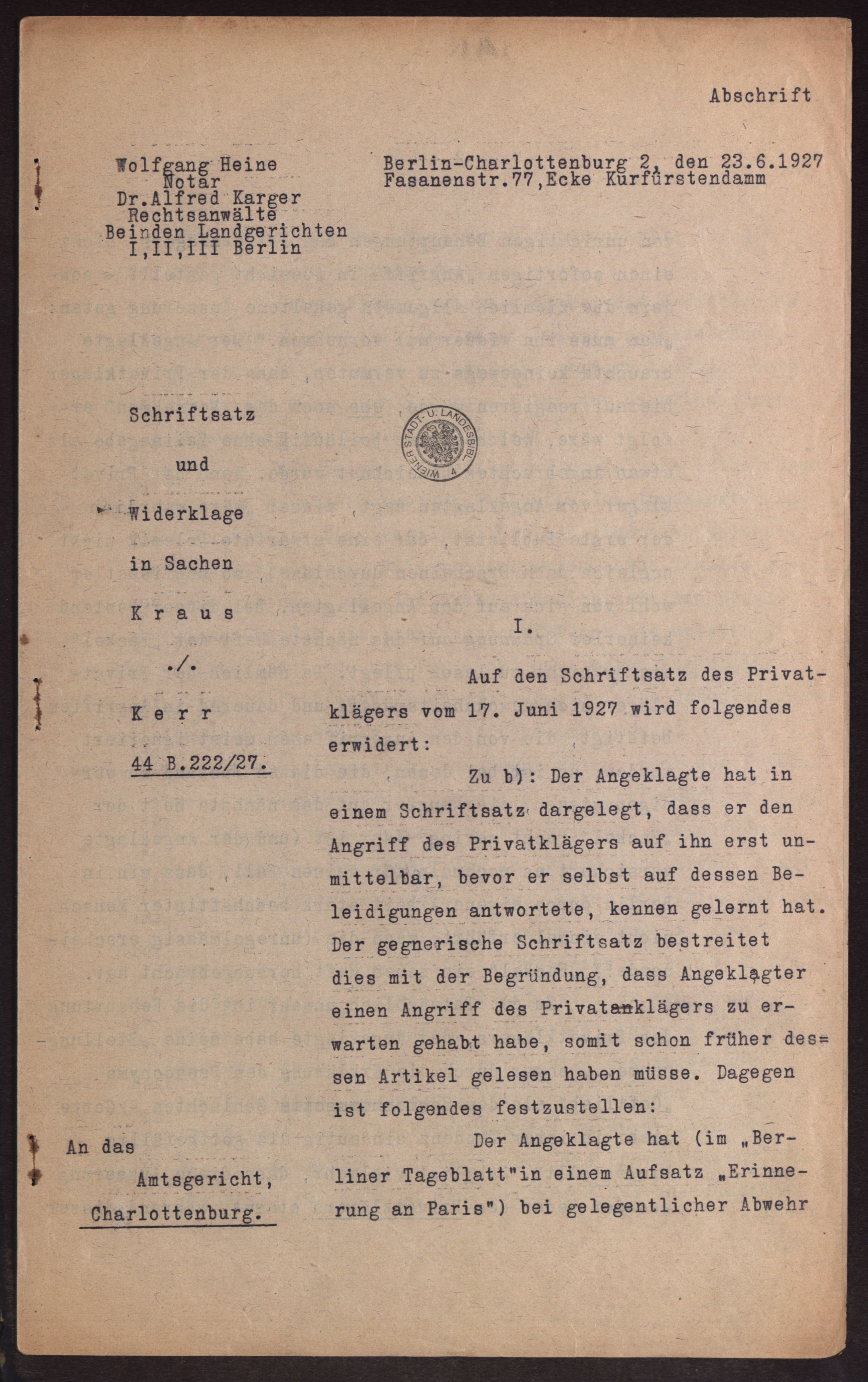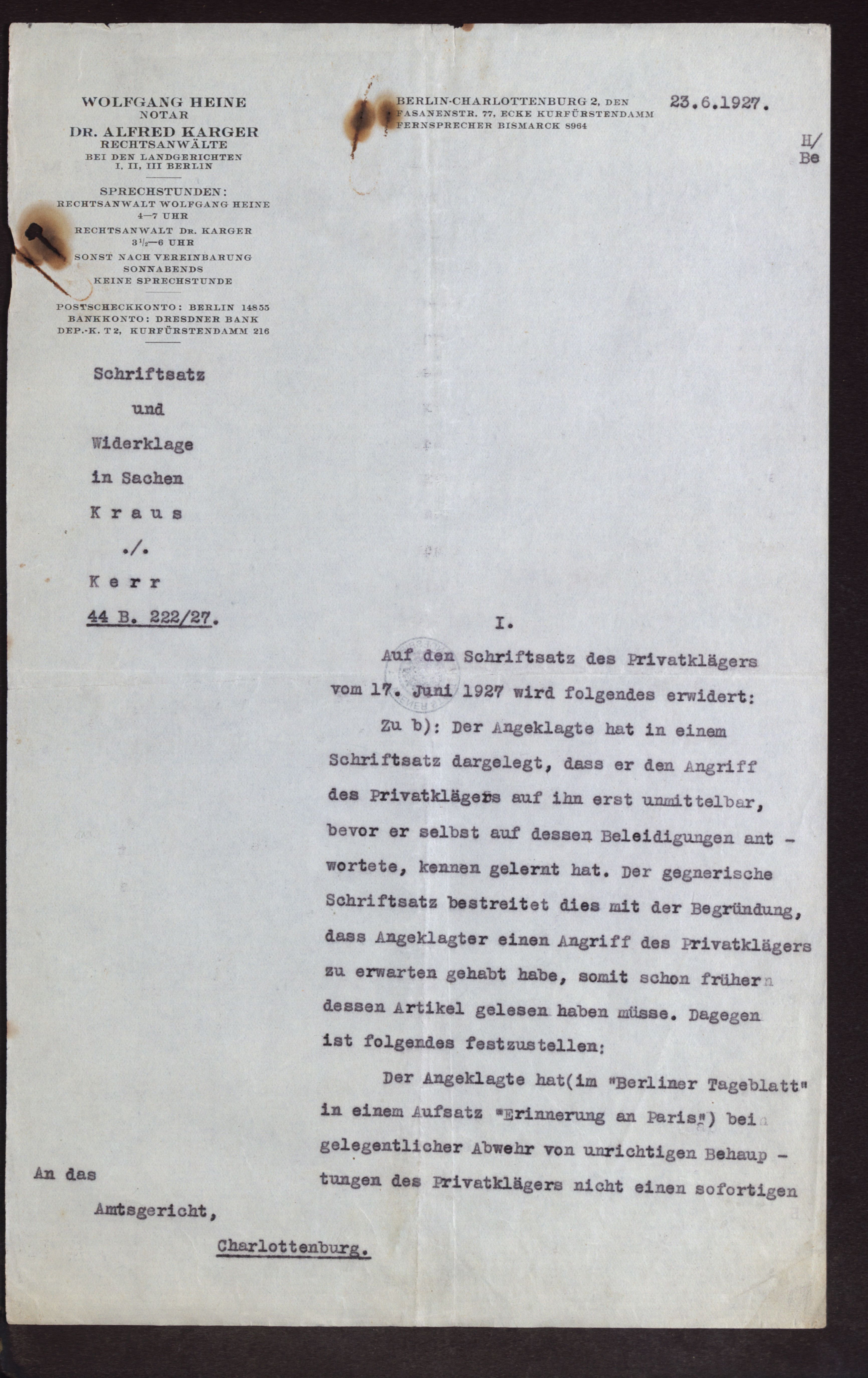 Signatur: ZPH 1545 - 68.27.Anzahl der Seiten: 17Hauptnummer: 68Nebennummer: 27Datum: 23.06.1927 >> Karl Kraus ca. Alfred Kerr