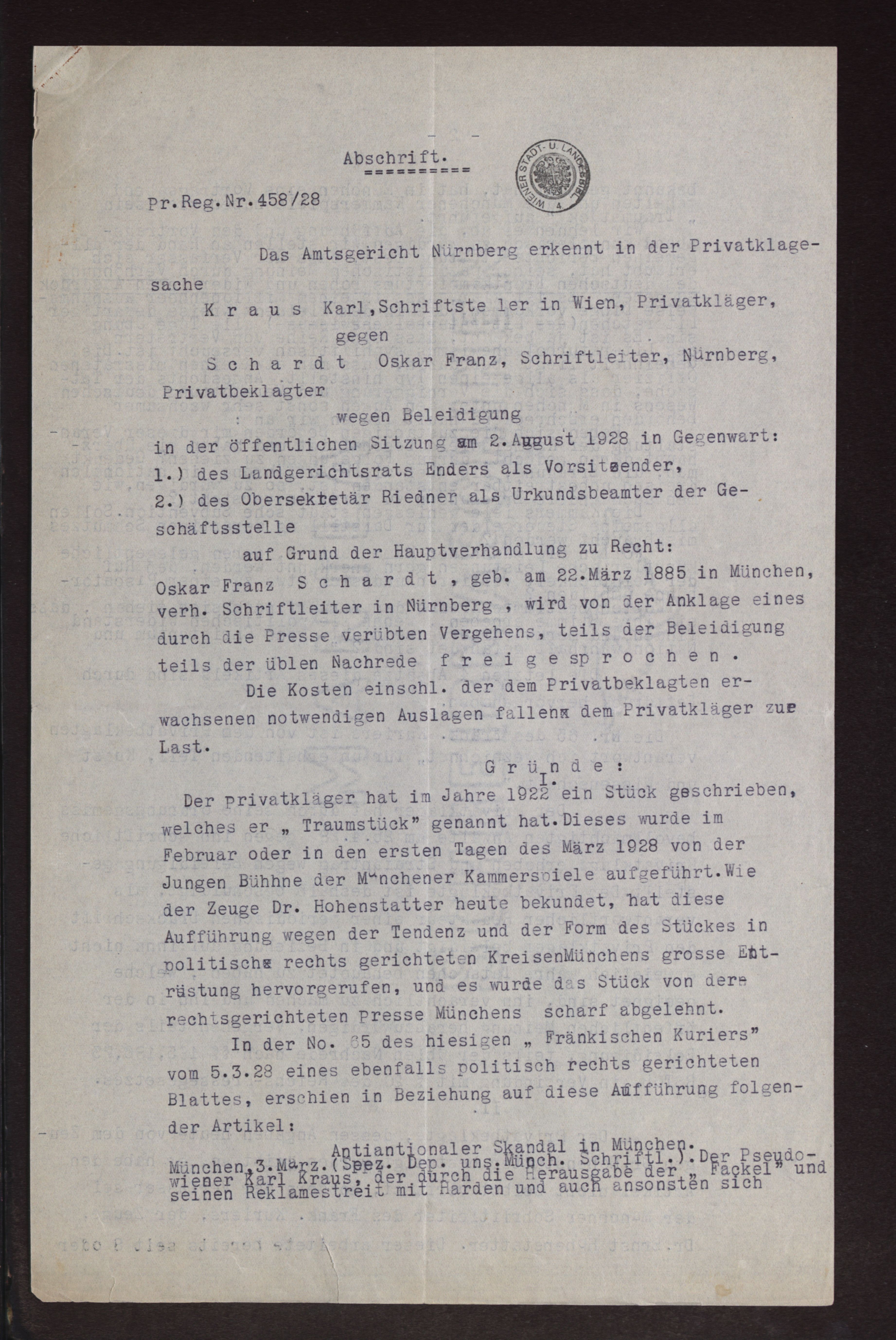Signatur: ZPH 1545 - 103.24.Anzahl der Seiten: 5Hauptnummer: 103Nebennummer: 24Datum: 02.08.1928 >> Karl Kraus ca. Fränkischer Kurier