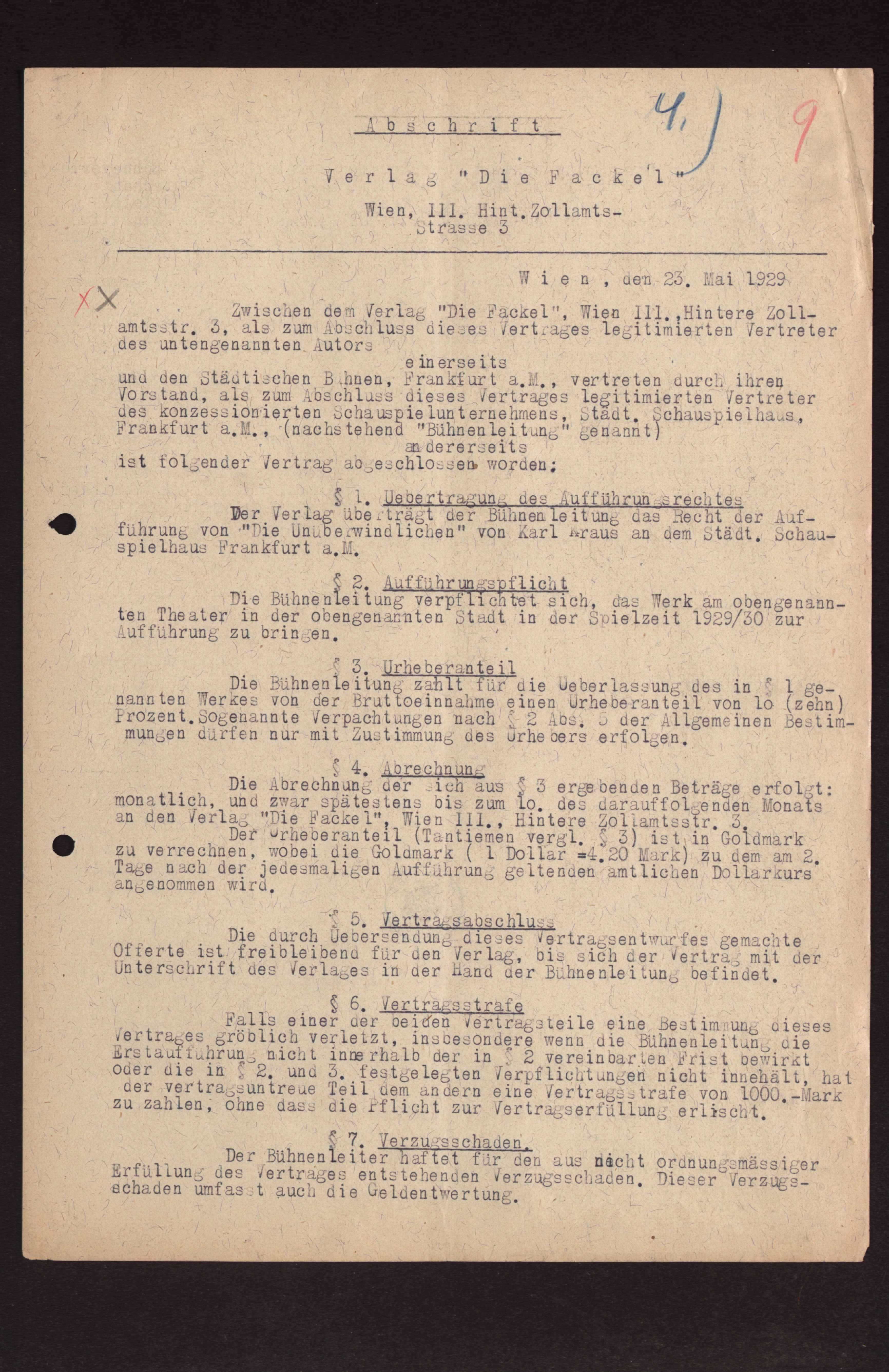 Signatur: ZPH 1545 - 125.5.Anzahl der Seiten: 4Hauptnummer: 125Nebennummer: 5Datum: 23.05.1929 >> Karl Kraus ca. Frankfurter Städtisches Schauspielhaus