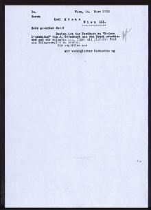 Brief Verlag Die Fackel an Universal-Edition Signatur: ZPH 1545 - 173.20.Anzahl der Seiten: 3>> Briefwechsel zwischen dem Verlag Die Fackel, dem Verlag Universal Edition und dem Deutschen Theater Prag