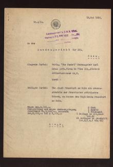 Klage des Verlages Die Fackel gegen die Stadt Frankfurt am Main als Konzessionärin der Frankfurter Städtischen Bühnen, zu Handen des Magistrats Frankfurt am Main (an das Landesgerichts für Z.R.S. ... Signatur: ZPH 1545 - 125.114.Anzahl der Seiten: 7>> Karl Kraus ca. Frankfurter Städtisches Schauspielhaus
