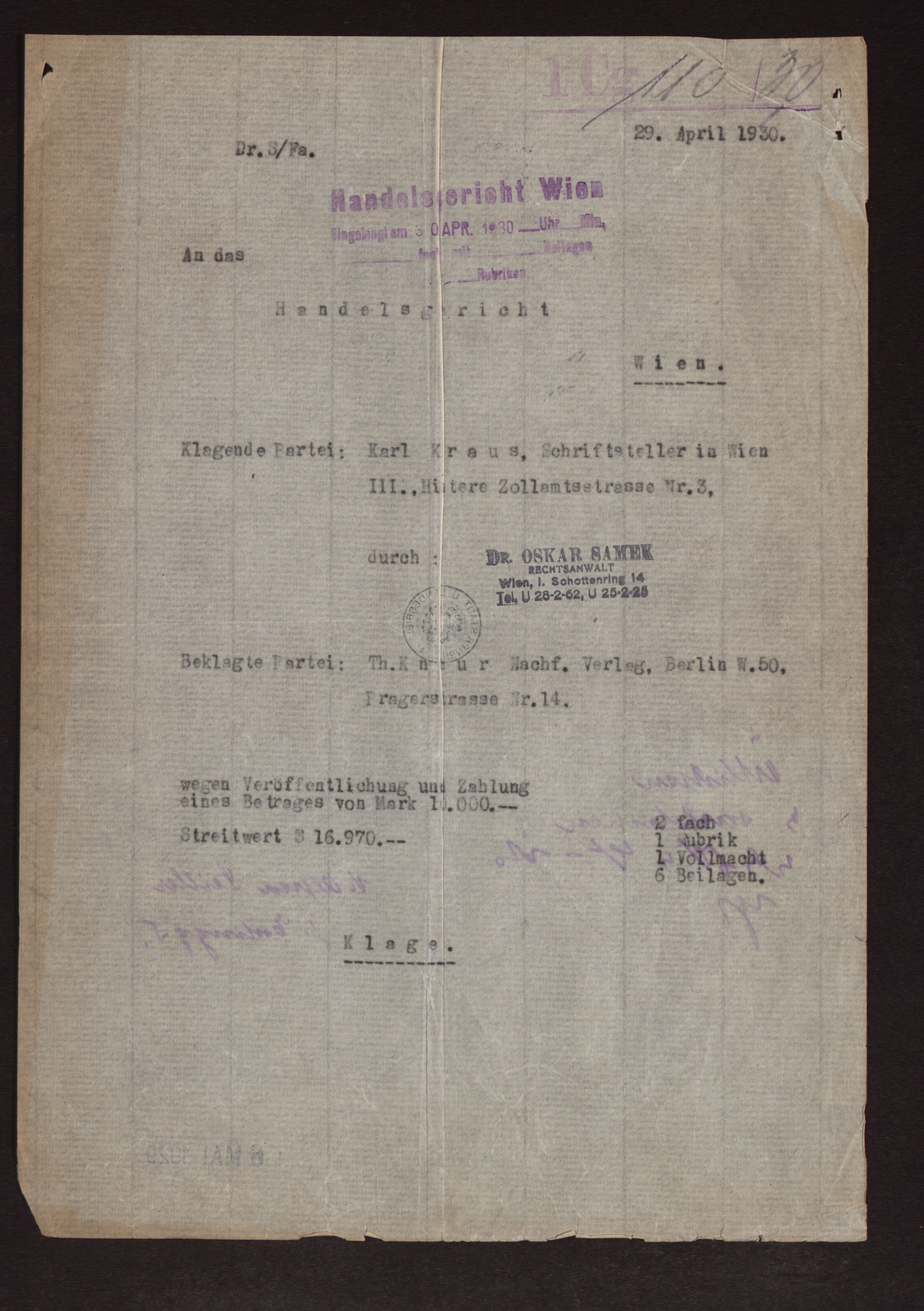 Signatur: ZPH 1545 - 142.10.Anzahl der Seiten: 3Hauptnummer: 142Nebennummer: 10Datum: 29.04.1930 >> Karl Kraus ca. Th. Knaur Nachf. Verlag (Berlin)
